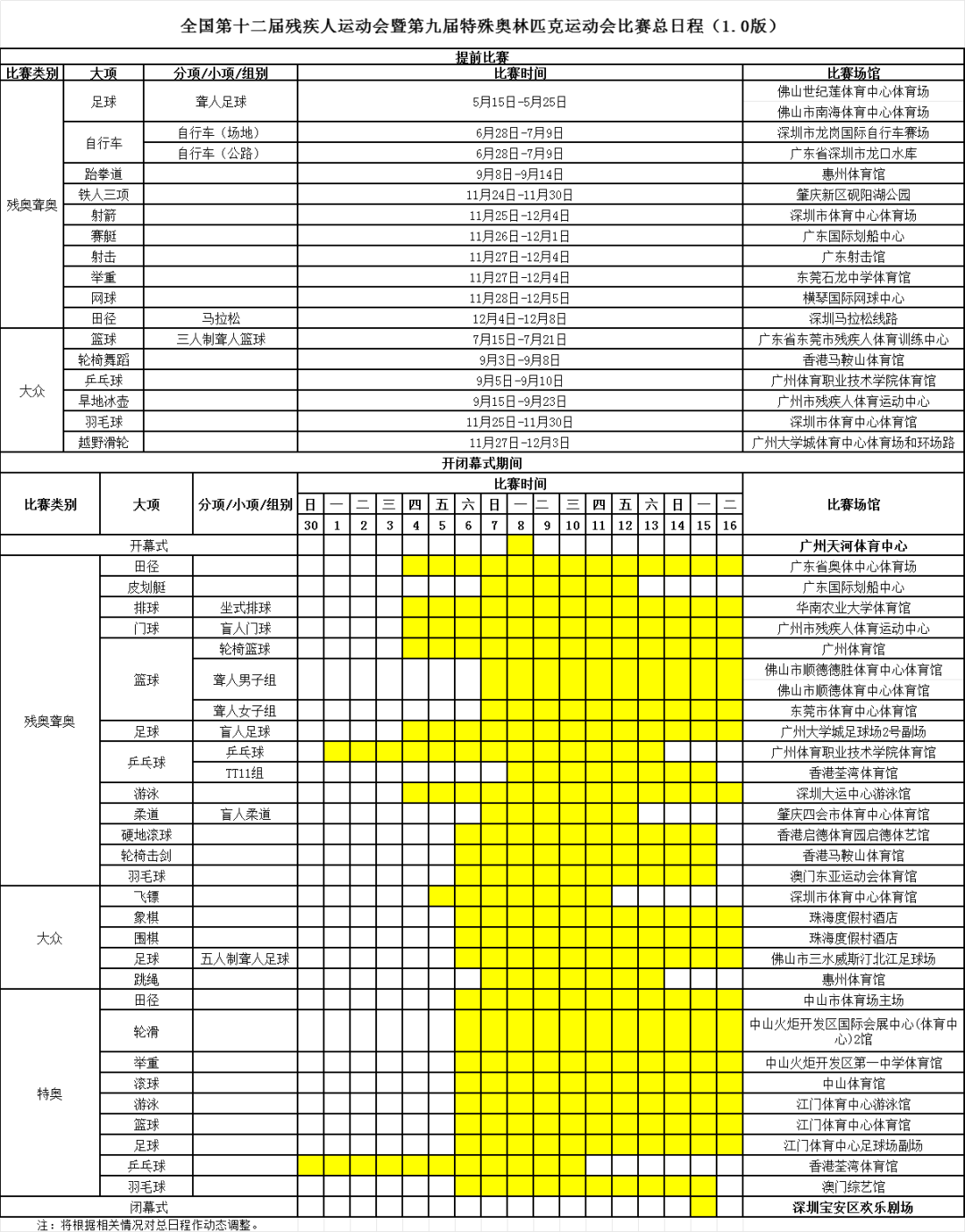 本届残特奥会将于12月8日至15日在粤港澳三地举办。开幕式将于12月8日在广州天河体育中心举办,闭幕式将于12月15日在深圳宝安区欢乐剧场举行。